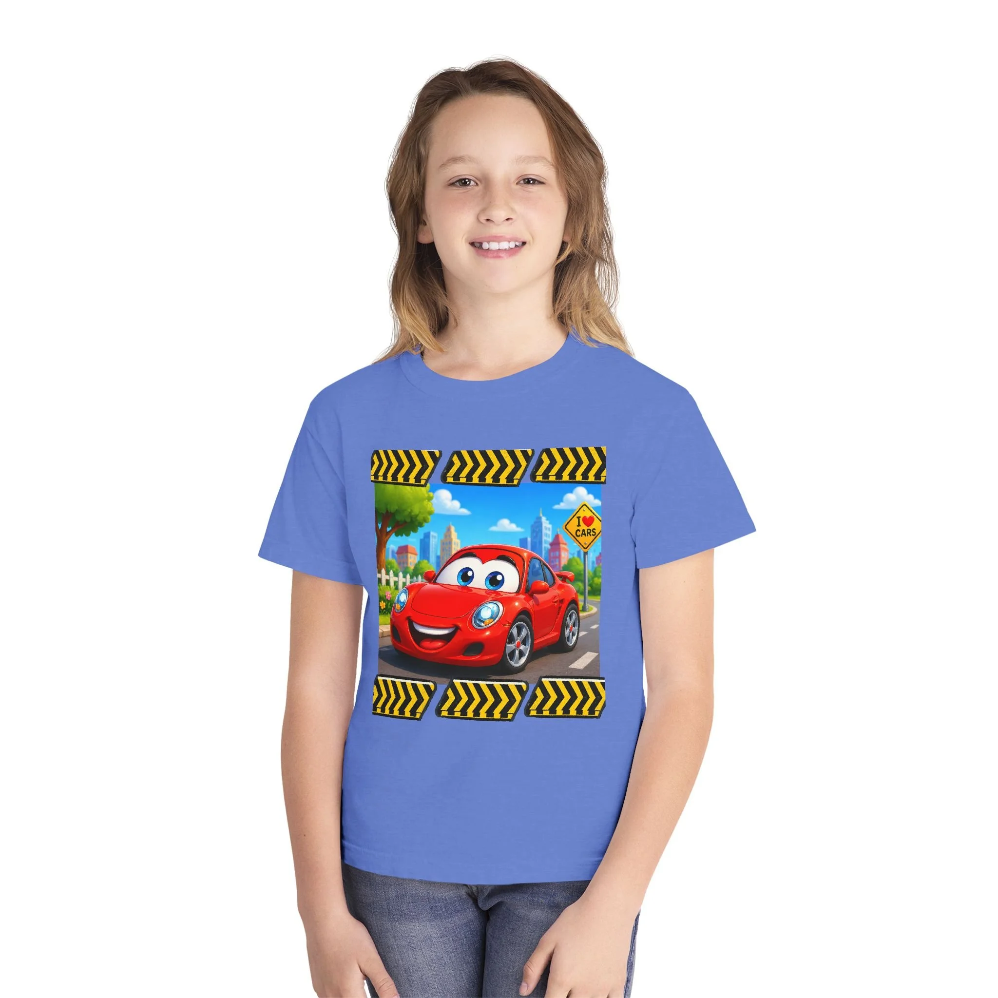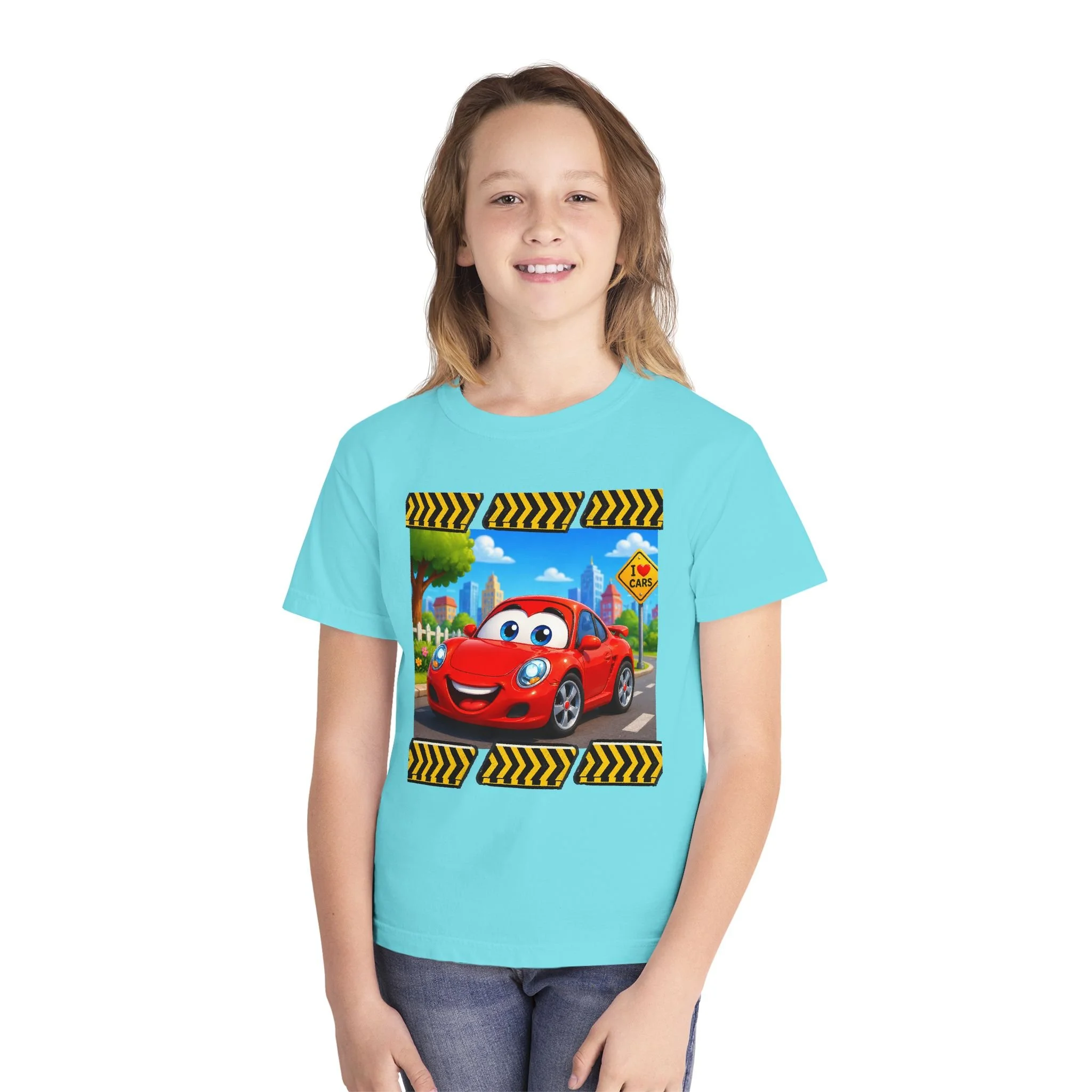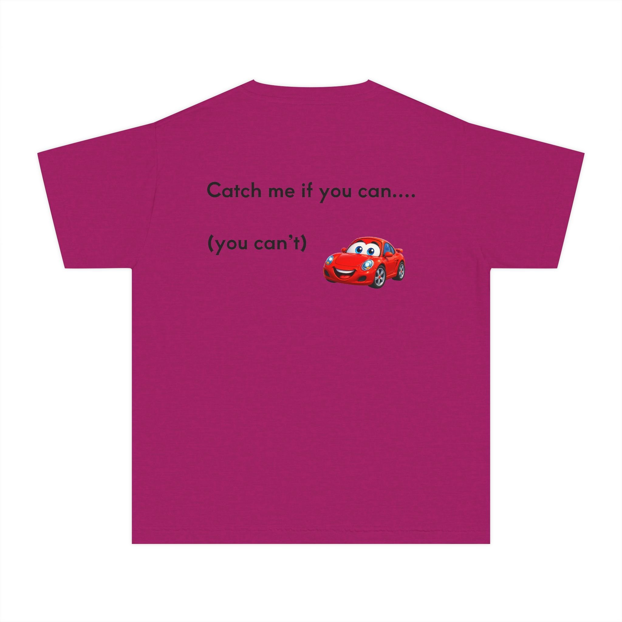 This cheerful youth tee brings a playful, high-energy vibe to everyday wear. A bright, cartoon-style red car races across the front panel, framed with bold yellow-and-black chevron accents — a look that sparks imagination and motion. The back carries a small matching car graphic with the cheeky line “Catch me if you can... (you can't)”, adding humor that kids will grin at and wear proudly. The garment-dyed, midweight cotton feels soft and lived-in from the first wear, while reinforced seams and neck tape stand up to active days and countless washes. It sits with a classic, comfortable cut so kids can run, jump, and play without fuss. Great for school, playdates, or weekend adventures, this tee blends durability with personality.
